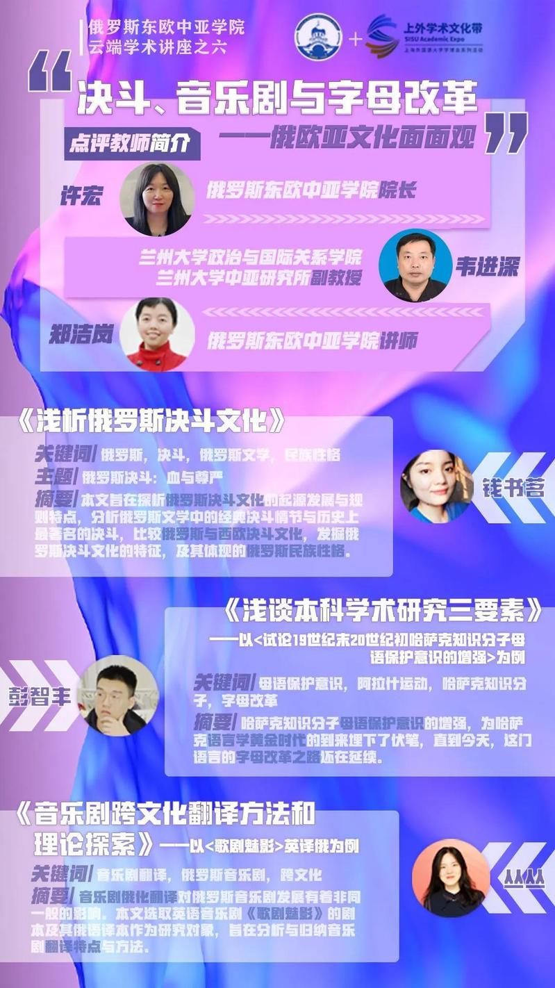 第六期学术角活动将于6月19日19:00-20:30以“决斗、音乐剧与字母改革——俄欧亚文化面面观”为主题进行研讨,通过俄欧亚学院学子的学术观点与心得感悟,带领大家走进俄欧亚的文化世界。