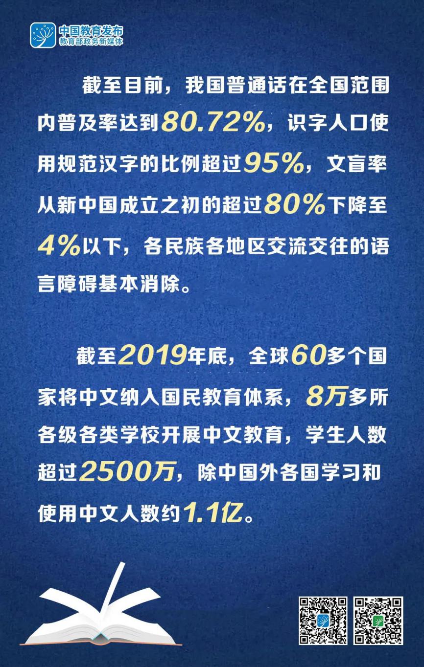 新中国成立以来,我国语言文字事业蓬勃发展,极大地促进了国家经济建设和教育、科技、文化等社会事业发展,为维护国家统一和民族团结、提高国民素质和社会文明程度发挥了不可替代的重要作用。截至目前,我国普通话在全国范围内普及率达到80.72%,识字人口使用规范汉字的比例超过95%,文盲率从新中国成立之初的超过80%下降至4%以下,各民族各地区交流交往的语言障碍基本消除。