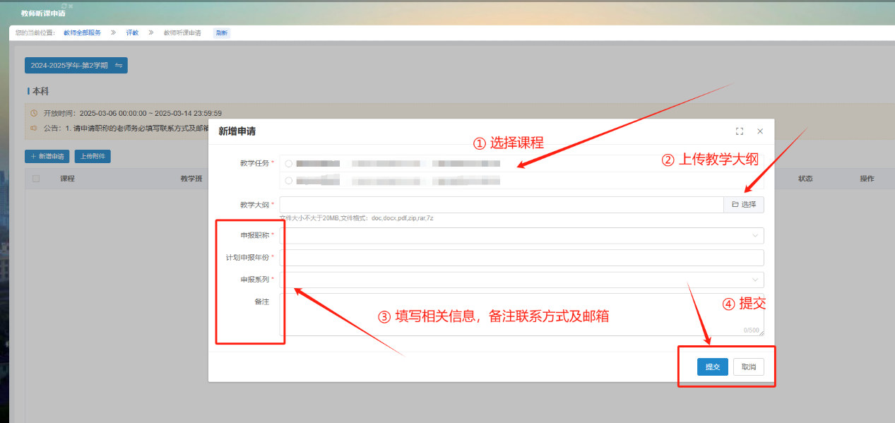 2. 选择要申请的课程,填写相关信息,提交教学大纲,请务必备注个人联系电话与邮箱,点击提交后,即完成申请。