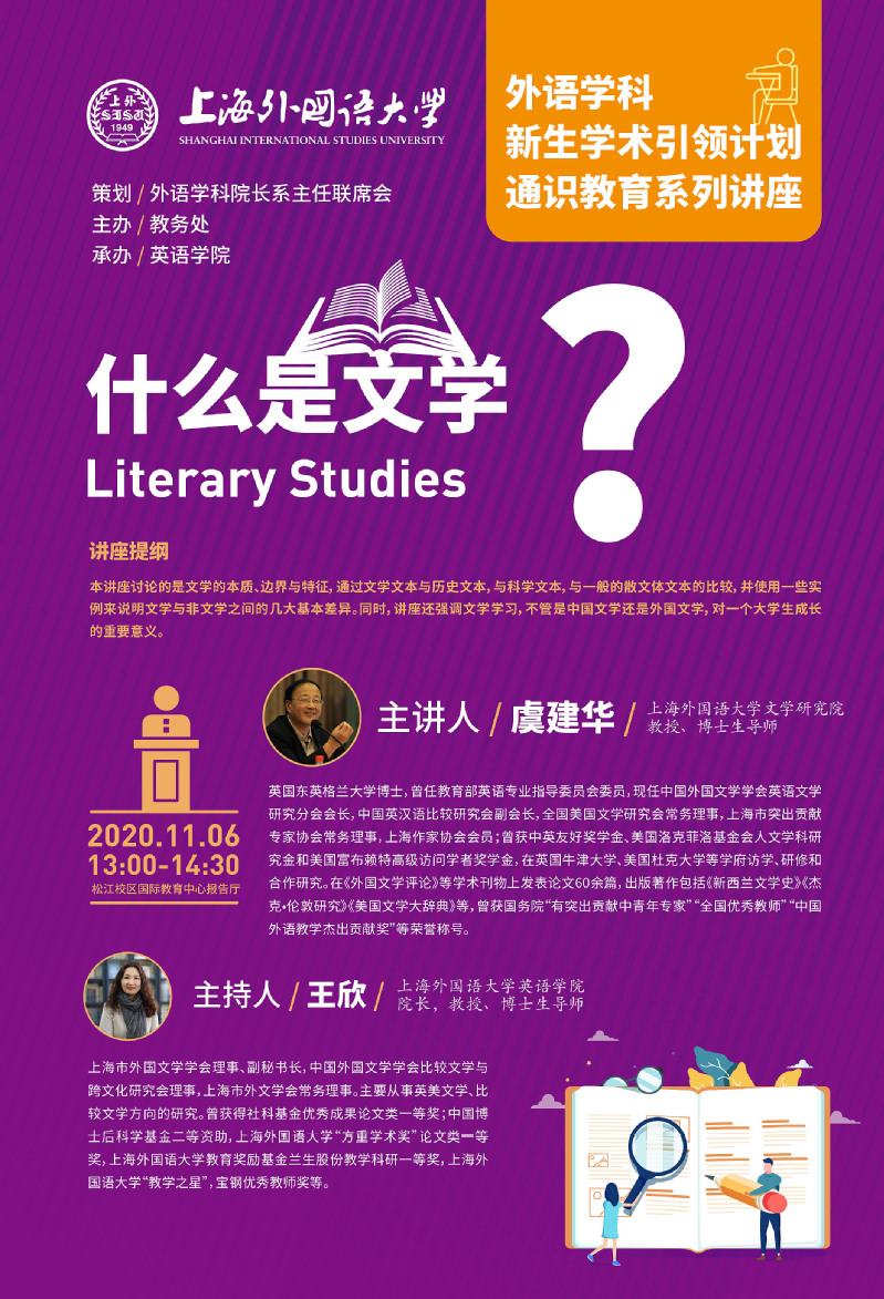 【编者按】为实现我校“会语言、通国家、精领域”的人才培养目标,帮助外语学科新生从一开始就对本学科的知识体系和研究领域有所了解,学校特邀请资深学者举办“外语学科新生学术引领计划”通识教育系列讲座,均以“什么是……?”为题,由各院系轮流承办,以展现外语学科的人文魅力,引领同学们进入外语学科的精彩世界。2020年11月6日,第二期外语学科新生学术引领计划通识教育系列讲座如期开讲,由上海外国语大学虞建华教授与新生分享:什么是文学。