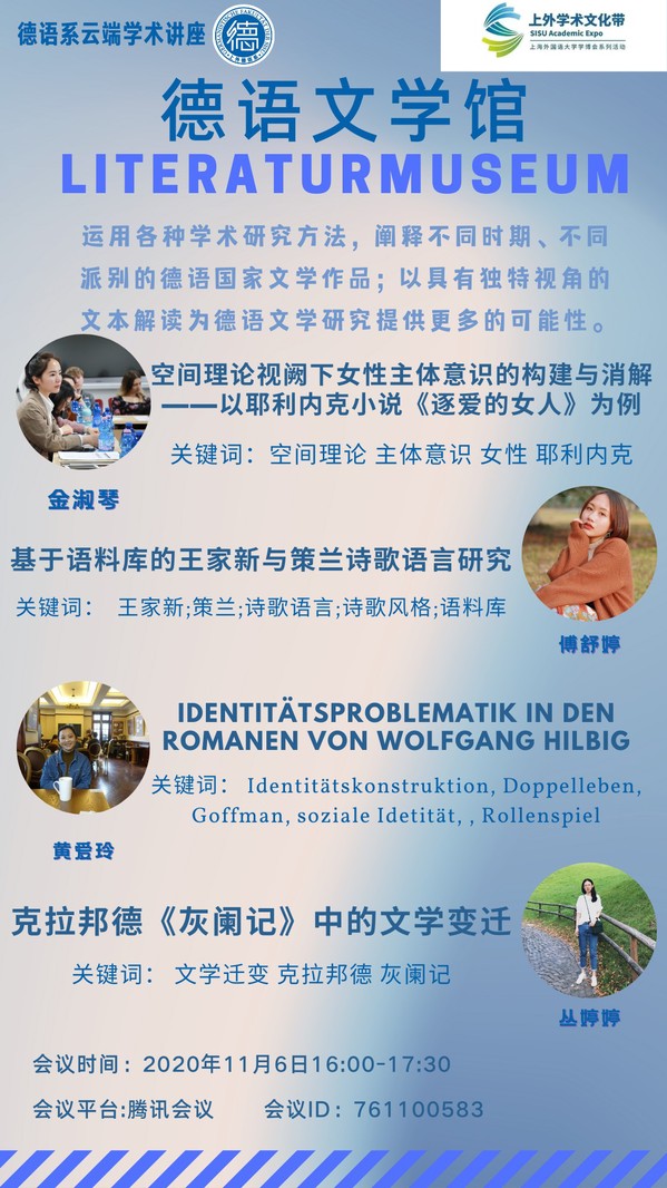 SISU云端学术角第十三期由教务处主办,由德语系承办,将于11月6日(周五)16:00准时开启!本期活动以「德语文学馆」为主题,运用各种学术研究方法,阐释不同时期、不同派别的德语国家文学作品;以具有独特视角的文本解读为德语文学研究提供更多的可能性。