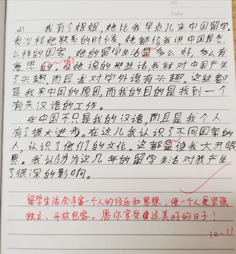 打开何晖老师的公众号“何老师的汉语课”,可以看到她尝试着将汉语课延伸至学生的日常生活中。近期,她在公众号上开启了一个留学生作文推送项目,通过文字、语音、照片、评语等多方位展示留学生的写作成果,为疫情期间受网课教学所限的留学生们提供了一个展示和交流的途径。在末尾,她这样写自己的初心:“用心写作的文字拥有温暖的力量。愿我们一起来感受外国留学生作文中的温情和真心,在希望中过好每一天。”
