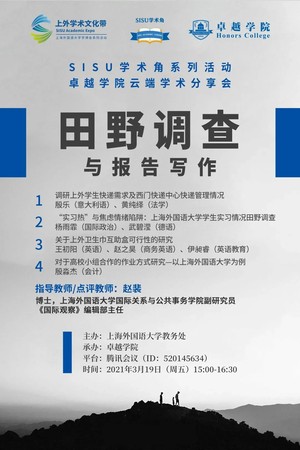 本学期,学术角活动继续与同学们在线上相约。SISU云端学术角第二十二期活动由教务处和卓越学院共同举办,活动主题是《田野调查与报告写作》,分享会将围绕该议题点评、研讨、交流本科生的四篇田野调查报告。