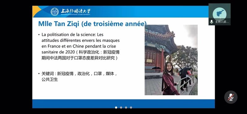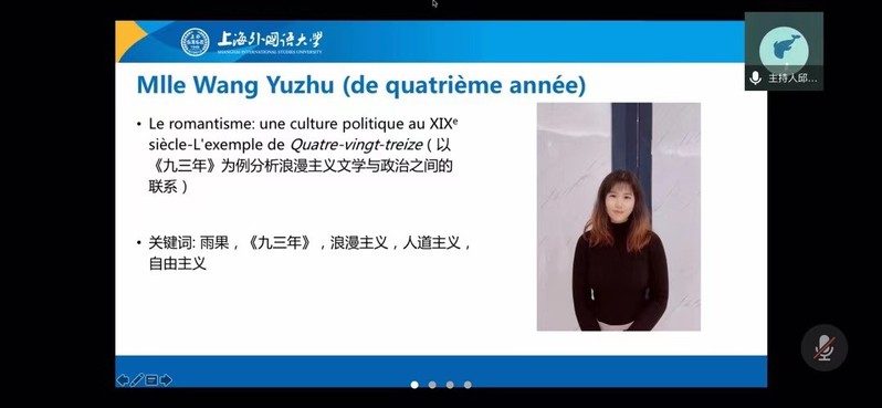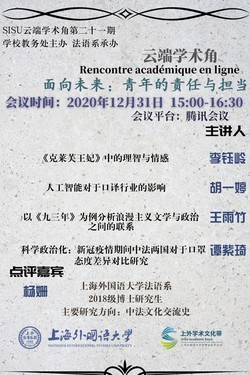 12月31日,由教务处主办、法语系承办的第二十一期云端学术角活动成功举办。本次活动以“面向未来:青年的责任与担当”为主题,由邱喆倩同学主持,邀请到李钰岭、胡一婷、王雨竹、谭紫琦等四位同学从文学、翻译、区域与国别研究等领域进行了生动地学术分享与交流。杨姗博士受邀担任点评嘉宾,对每一位同学的主题分享提出了自己的意见与建议,同时表达了对同学们的热切期望,希望大家能够再接再厉!