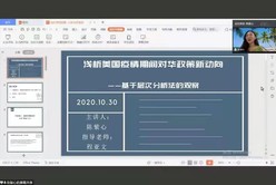 10月30日,由教务处主办、国际关系与公共事务学院承办的第十二期云端学术角活动成功举办。本期活动以“中美战略博弈”为主题进行了深入讨论,陈紫心、杨雨霏、贺筱麟、刘千歌等四位同学作主题发言。王联合教授对几位同学的汇报表示肯定,并对各位同学的研究分别提出了评价和建议。国际关系与公共事务学院本科教学负责人盛春红老师在活动中积极鼓励同学们多多参加学术活动,拓展学术交流。