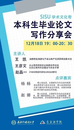 12月18日,由教务处主办、东方语学院承办的第十九期云端学术角活动成功举办。本期活动邀请到王凯、赵晶一、王彦文等三位同学分享了毕业论文写作经历,另外,还请到杨杨、赵娜两位博士对同学们的论文介绍进行了点评、研讨、交流。活动中,汇报人和点评嘉宾们纷纷从不同角度展示了自己的思考和理解,分享了一系列宝贵的学术感悟和心得。这次活动让同学们接触和认识到更多的学术研究方法,进一步扩宽了同学们的学术思维和眼界。