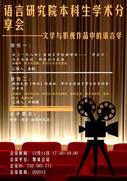 12月11日,由教务处主办、语言研究院承办的第十八期云端学术角活动成功举办。本次活动的主题为“文学与影视作品中的语言学”,由姜懿、许瑞璇两位同学围绕活动主题分别作了精彩的报告,他们与参会同学和老师分享了自己的观点和见解,林皓老师对同学们的报告给予了高度评价和指导点评,并鼓励参加活动的同学们努力激发学术兴趣,不断提升学术水平。