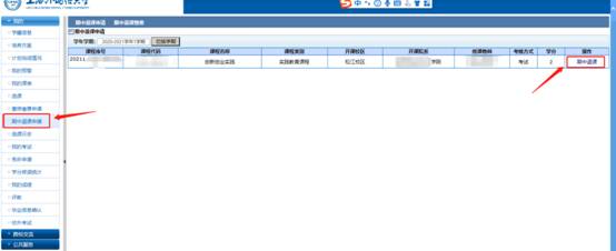 学生需在教务系统在规定时间内申请期中退课。点击需期中退课课程信息右侧的 “期中退课”按钮,即可完成申请。