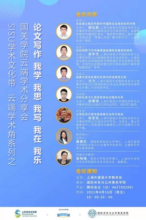 SISU云端学术角第二十四期活动由教务处主办,国际关系与公共事务学院承办,将于4月16日18:00准时开启!本期活动以“我学、我思、我写、我在、我乐”为主题,通过题目自拟,公开征集论文的方式,共收到18篇论文,从中遴选出5篇进行展示;此次活动将呈现学生们丰富多彩的学术兴趣,分享写作中的思索与乐趣,同时邀请专家进行点评,不断提升写作水平,展现国关学子“爱读书、爱写作”的风采。SISU云端学术角,期待您的积极参与!