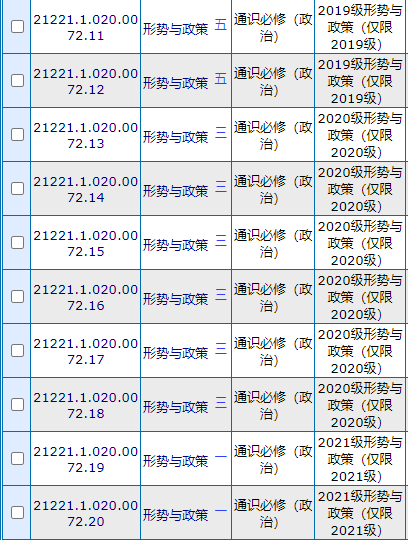 2.“形势与政策”为1-8学期连续课程,每学期8学时,请同学们注意上课时间,按时选课,留意课程名称右侧的对应数字;