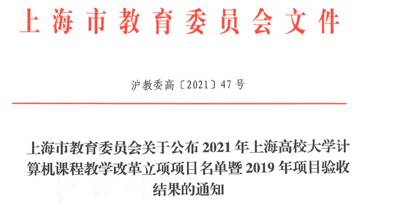 近日,上海市教委发布《上海市教育委员会关于公布2021年上海高校大学计算机课程教学改革立项项目名单暨2019年项目验收结果的通知》(沪教委高〔2021〕47号),批准并公布了2021年上海高校大学计算机课程教学改革项目的立项名单以及2019年上海高校大学计算机课程教学改革项目的结项名单。