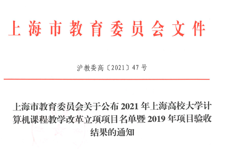 近日,上海市教委发布《上海市教育委员会关于公布2021年上海高校大学计算机课程教学改革立项项目名单暨2019年项目验收结果的通知》(沪教委高〔2021〕47号),批准并公布了2021年上海高校大学计算机课程教学改革项目的立项名单以及2019年上海高校大学计算机课程教学改革项目的结项名单。