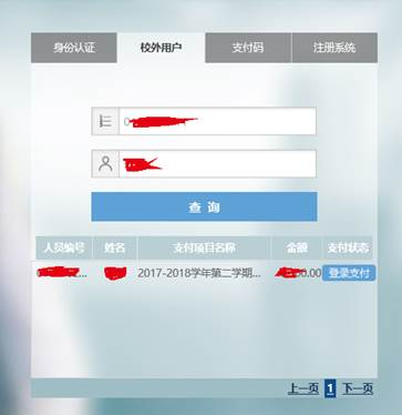 1.打开浏览器,在地址栏输入http://epay.shisu.edu.cn/进入上海外国语大学收费服务管理系统。点击校外用户标签页,人员编号栏输入本人的身份证号(留学生、港澳台学生的证件号为教务系统中登记的证件号码,具体可联系所在院系查询),姓名栏输入学生姓名,然后点击查询按钮,查询到需要缴费的项目,点击登录支付按钮(如图例示):