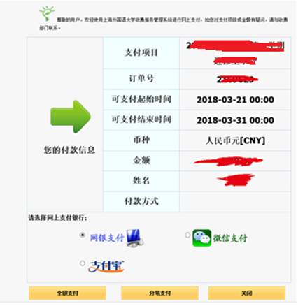 2. 进入付款页面,学生核对完自己信息无误后,有三种支付方式可选择(如图例示):