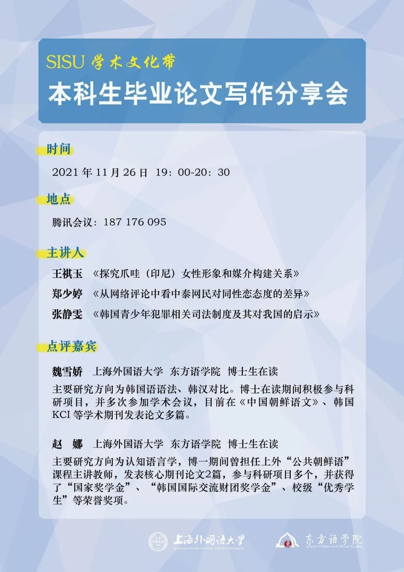 SISU云端学术角第三十四期由教务处主办、东方语学院承办,以「本科生毕业论文写作分享会」为活动主题,将于11月26日19:00准时开启,欢迎大家积极参与!