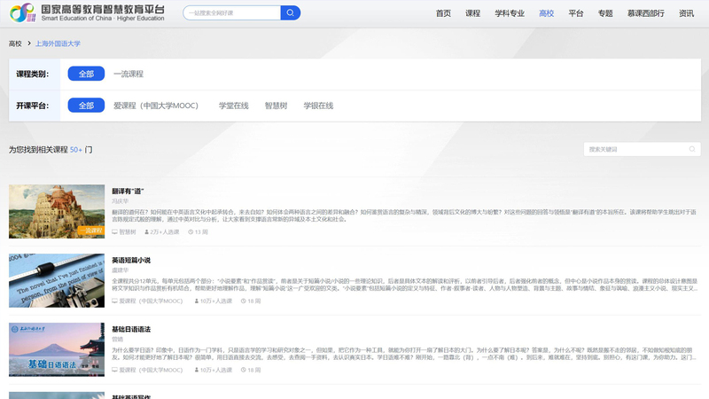 国家智慧教育平台是教育部推出的教育数字化战略行动取得的阶段性成果,一期项目包括国家中小学智慧教育平台、国家职业教育智慧教育平台、国家高等教育智慧教育平台、国家24365大学生就业服务平台。国家高等教育智慧教育平台(简称“智慧高教”)广泛汇聚优质课程资源,首批上线2万门优质课程,覆盖13个学科92个专业类。上海外国语大学《翻译有“道”》等国家级、上海市线上一流本科课程领衔的50门慕课作为首批课程登陆该平台。“智慧高教”平台同时链接“爱课程”和“学堂在线”两个在线教学国际平台,向世界提供900余门多语种课程,我校“国际组织概览与探析”“宏观经济学”“健康管理”和“塑身瑜伽”等4门课程作为首批在爱课程国际平台上线的课程面向全球开放。