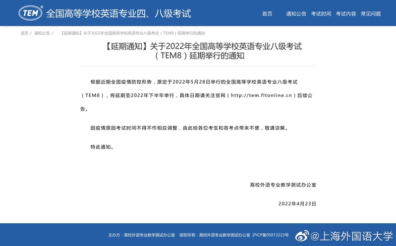 转发高校外语专业教学测试办公室《关于2022年全国高等学校英语专业八级考试(TEM8)延期举行的通知》。