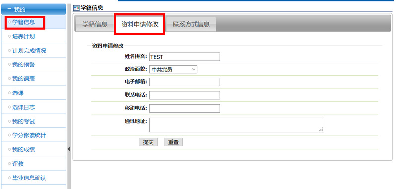 3. 姓名拼音或政治面貌需要更新的,在我的>>学籍信息>>资料申请修改标签页提交修改申请。提交申请的同学建议填写移动电话。
