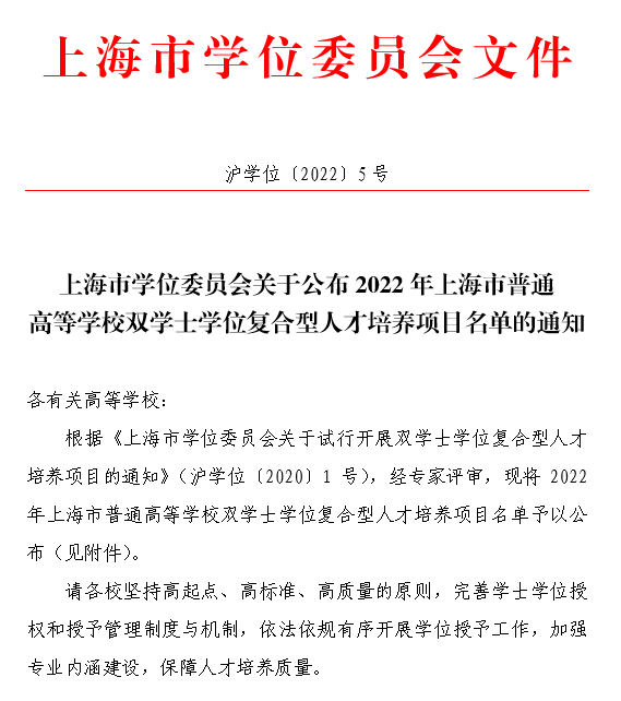日前,上海市学位委员会发布了《上海市学位委员会关于公布2022年上海市普通高等学校双学士学位复合型人才培养项目名单的通知》(沪学位〔2022〕5号),我校申报的双学士学位复合型人才培养项目:“俄语—工商管理”获准设立,这是学校第5个获批的双学士学位复合型人才培养项目。