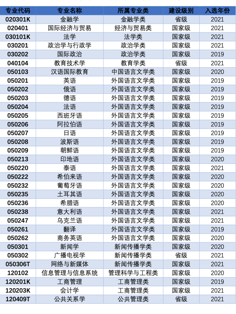 近年来,学校全面落实立德树人根本任务,立足国家重大战略需求和区域经济社会发展的需求,持续推进“多语种+”办学战略,持续加强专业内涵建设,提升人才培养质量。学校陆续研制发布《一流本科教学建设项目管理办法》《人才培养方案修订指导意见》《优秀教学成果奖励办法》《课程思政“课程链”建设工作的实施意见》《进一步推进慕课建设与应用的指导意见》《通识教育选修课管理办法》《教材出版资助管理办法》等重要文件,优化本科教学建设管理模式,大幅度提升本科教学建设项目支持,推进“招生-培养-就业”联动,加强“科教产学”融合,以“一流本科教学、一流专业建设、一流人才培养”为主线,加强工作顶层设计,夯实教学基础提升,从培养体系、课程体系、教材体系、教学体系和管理体系多维度构建“一流本科”,打造“一流专业体系”。2019年一流本科专业建设“双万计划”实施以来,学校陆续新增10个本科专业,不断丰富本科专业体系;累计推荐33个专业申报一流本科专业,最终全部获批,实现入选率100%,持续提升专业质量。