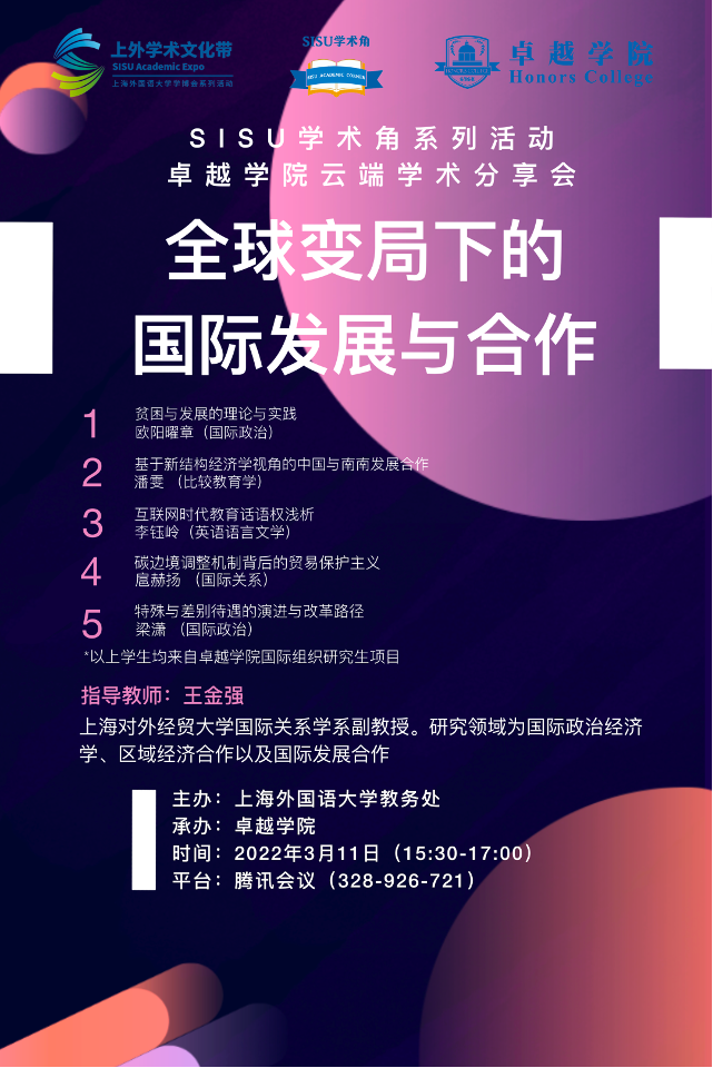 SISU云端学术角第三十七期由教务处主办、卓越学院承办,以「全球变局下的国际发展与合作」为活动主题,将于3月11日15:30准时与同学们在线上相约。