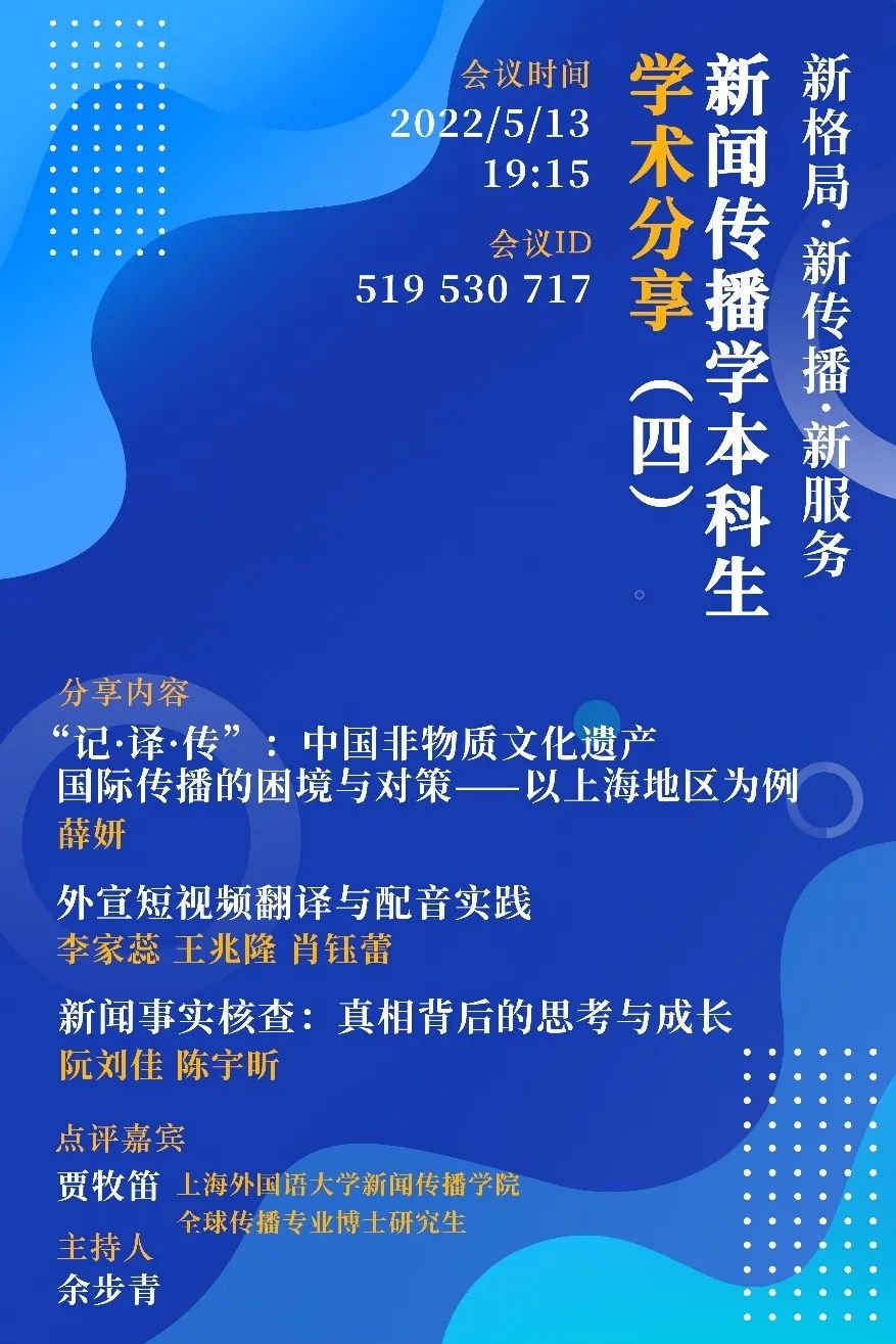 SISU云端学术角第四十一期由教务处主办、新闻传播学院承办,以“新格局·新传播·新服务——新闻传播学本科生学术分享(四)”为活动主题,将于5月13日19:15,准时与同学们在线上相约,敬请参与!