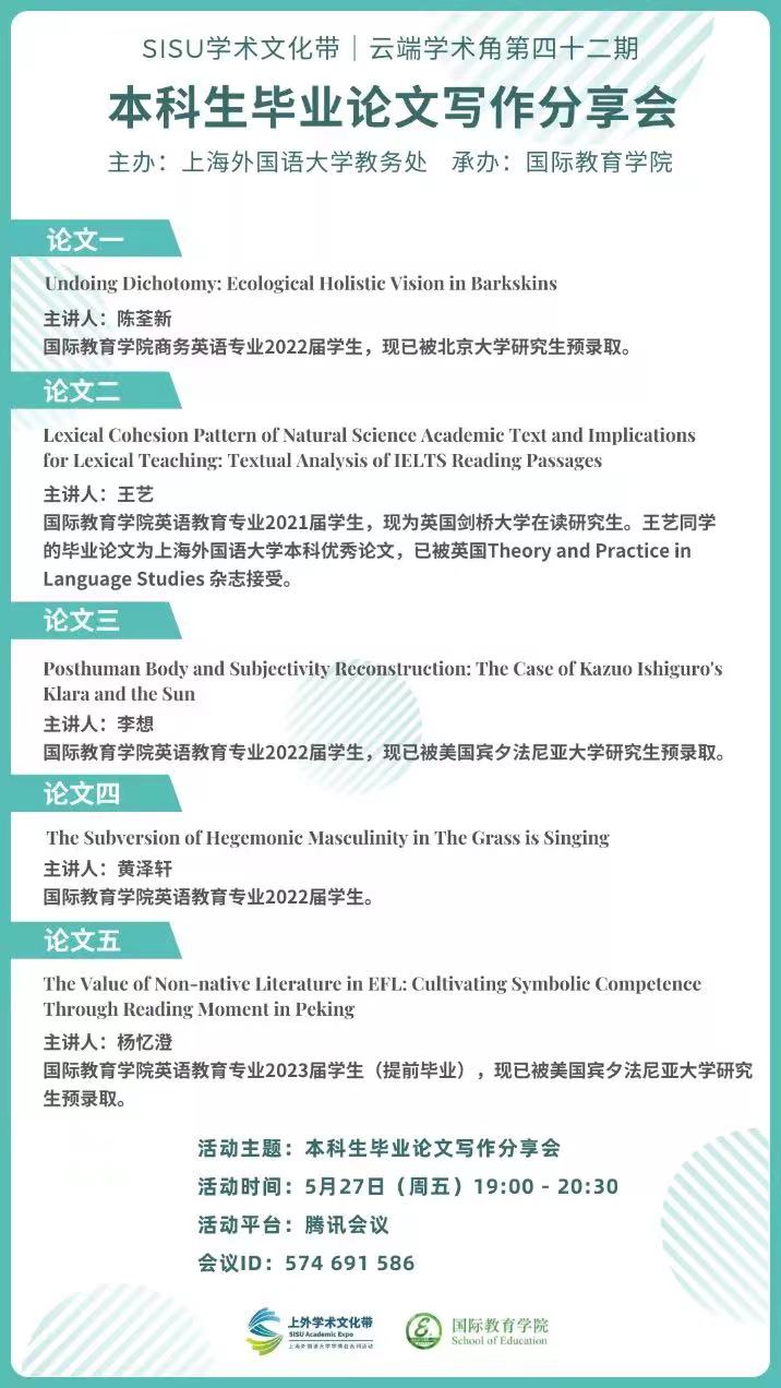 SISU云端学术角第四十二期由教务处主办、国际教育学院承办,以“本科生毕业论文写作分享会”为活动主题,邀请到五名在聂薇老师指导下完成毕业论文的同学,他们将从不同角度展示学术写作的思考和理解,分享毕业论文撰写的感悟和心得。本次活动将于5月27日19:00,准时与同学们在线上相约,敬请参与!