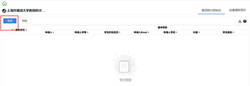 点击“新建”在线填写信息,系统会自动根据学生类别和年级确定研讨课级别,请补填其他所需信息,确认无误后点击报名申请(每人只能提交一次,限选一门,提交后无法修改,可以查看)。