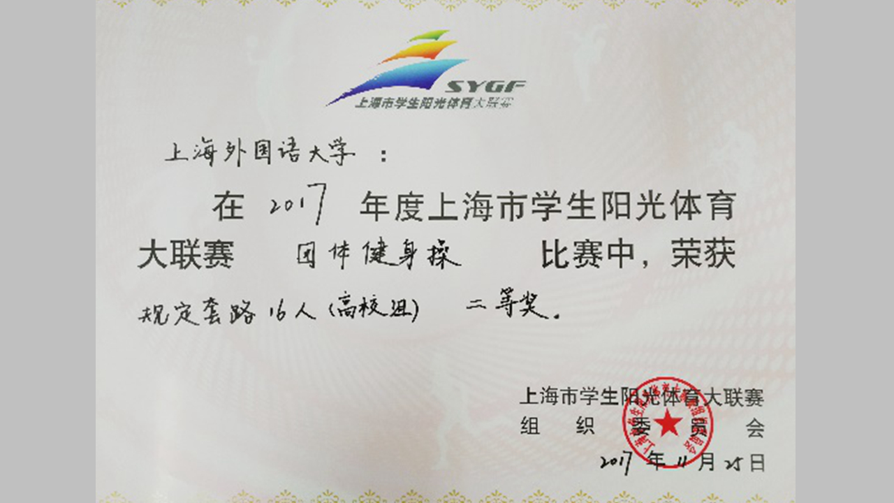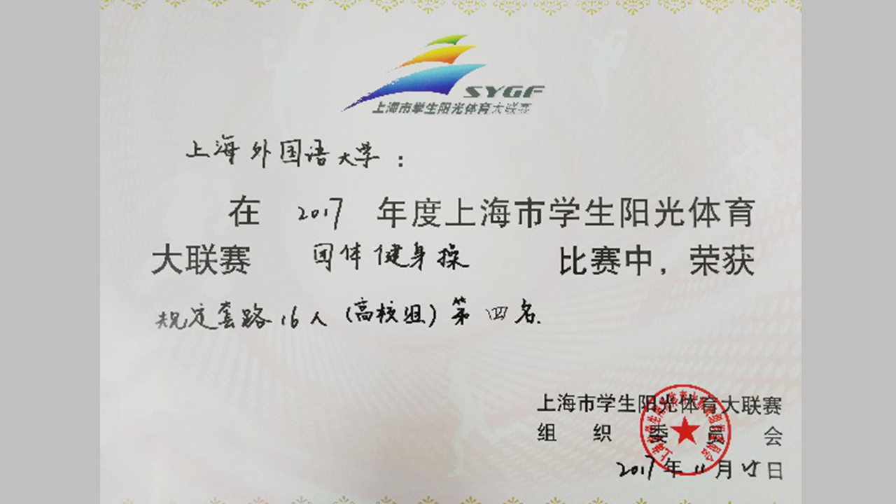 近日,上外健美操队参加了由上海市教育委员会、上海市体育局和共青团上海市委员会主办,由上海市学生活动管理中心、上海市青少年训练管理中心和同济大学承办的2017年度上海市学生阳光体育大联赛团体健身操比赛,上外健美操队在领队刘海荣老师、教练李凌姝老师的带领下荣获第四名,二等奖。