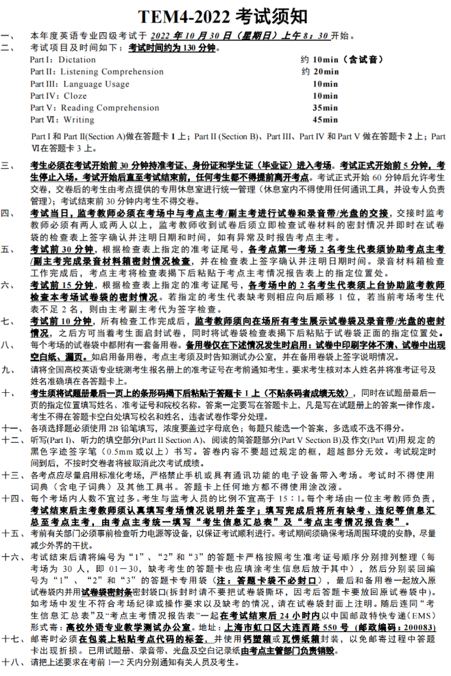 2022年英语专业四级考试将于2022年10月30日上午在松江校区举行,特别强调以下几点注意事项,请考生们重视并认真做好准备,以免影响考试: