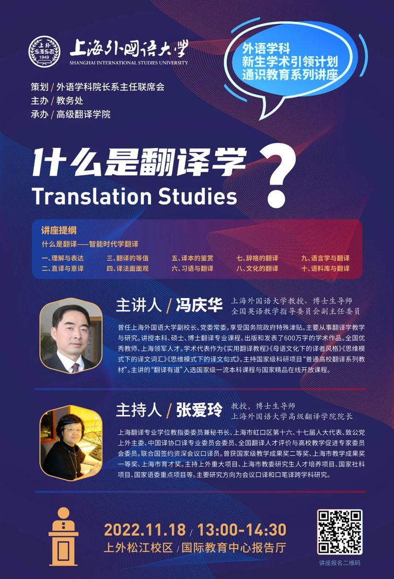 为实现我校“会语言、通国家、精领域”的人才培养规格,帮助外语学科新生从一开始就了解本学科的知识体系和研究领域,提升外语能力,掌握基本的学术研究方法,学校特邀请资深学者举办“外语学科新生学术引领计划”通识教育系列讲座。2022年11月11日,第一期外语学科新生学术引领计划通识教育系列讲座在上外松江校区成功举办,查明建教授同大家分享:什么是比较文学。讲座由日本文化经济学院院长高洁教授主持。