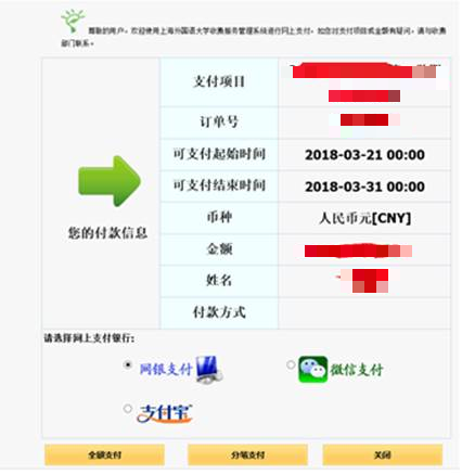 2.进入付款页面,学生核对自己信息无误后,有三种支付方式可选择(如图例示):