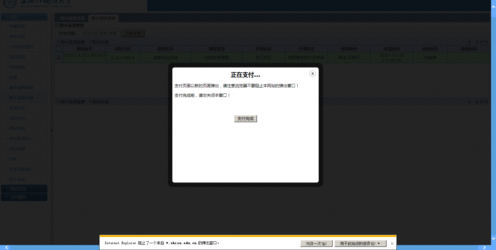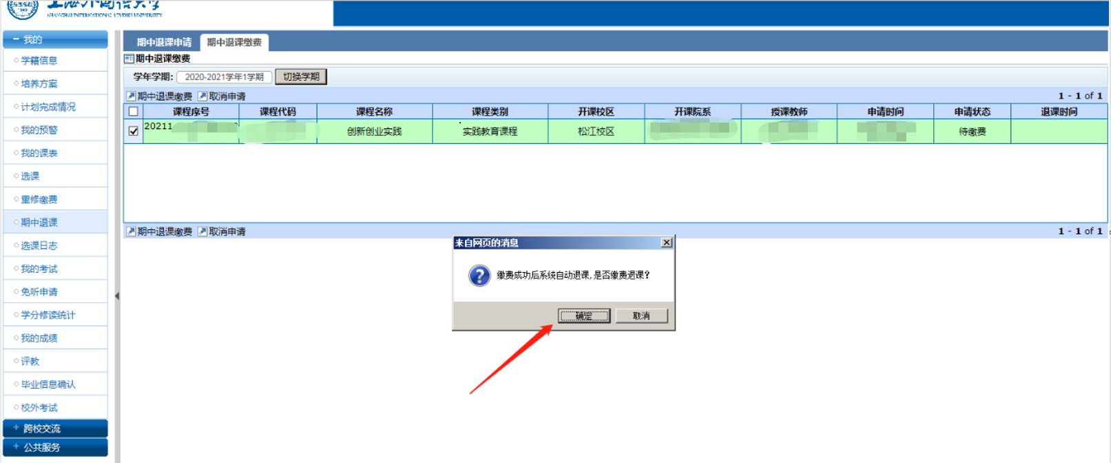 缴费成功后,请回到“我的课表”,查看自己的课表内容,确认申请期中退课的课程已从课表中移除。