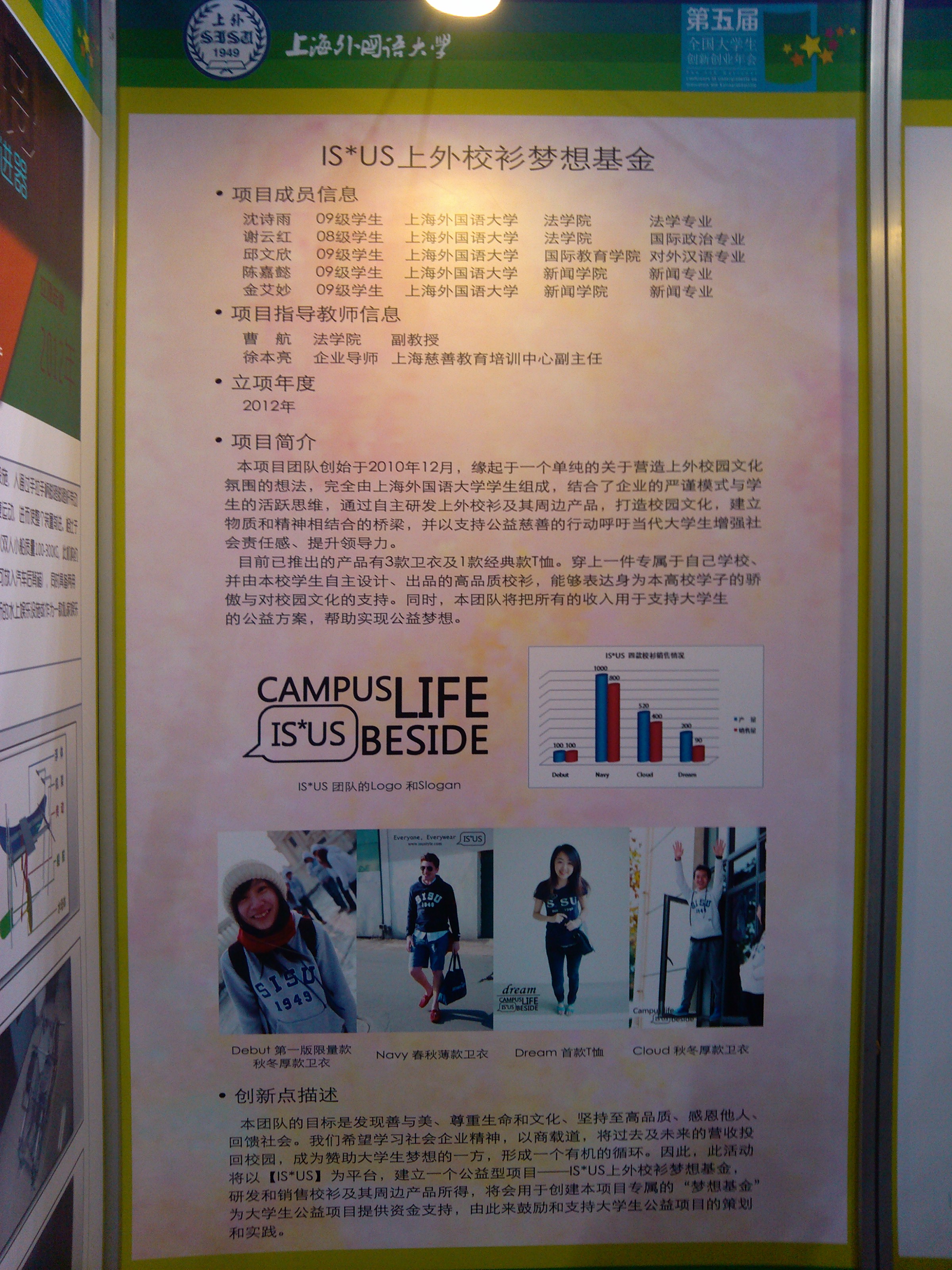 11月24日至25日,由教育部、科技部联合主办的第五届全国大学生创新创业年会在中国农业大学举行。教育部党组成员、部长助理林蕙青出席大会并致辞。共有来自全国160余所高校的800多位师生参加了年会。我校2012年立项的国家级创业实践项目《IS*US上外校衫梦想基金》入围年会展示项目并获得好评。
