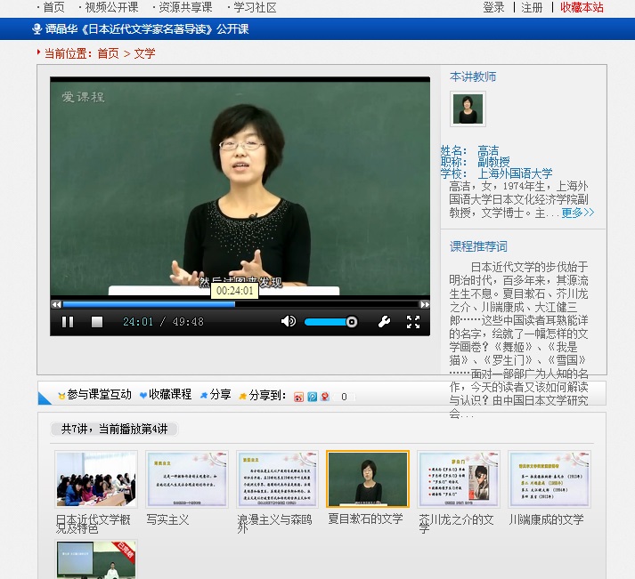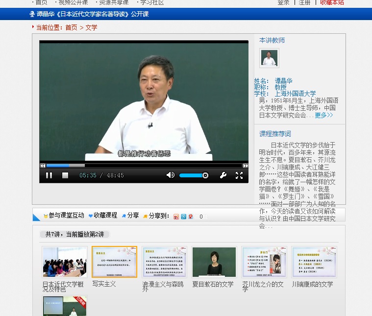 近日,由我校谭晶华教授领衔主讲、日本文化经济学院高洁、徐旻副教授参与讲授的《日本近代文学家名著导读》课程(全7讲)由“爱课程”网站正式发布(http://www.icourses.cn/viewVCourse.action?courseId=ff8080813ff49e1f013ff5c39745006c#),同时,网易公开课、央视公开课也进行了同步。成为我校第一门全面完成并正式上线的“中国大学视频公开课”。