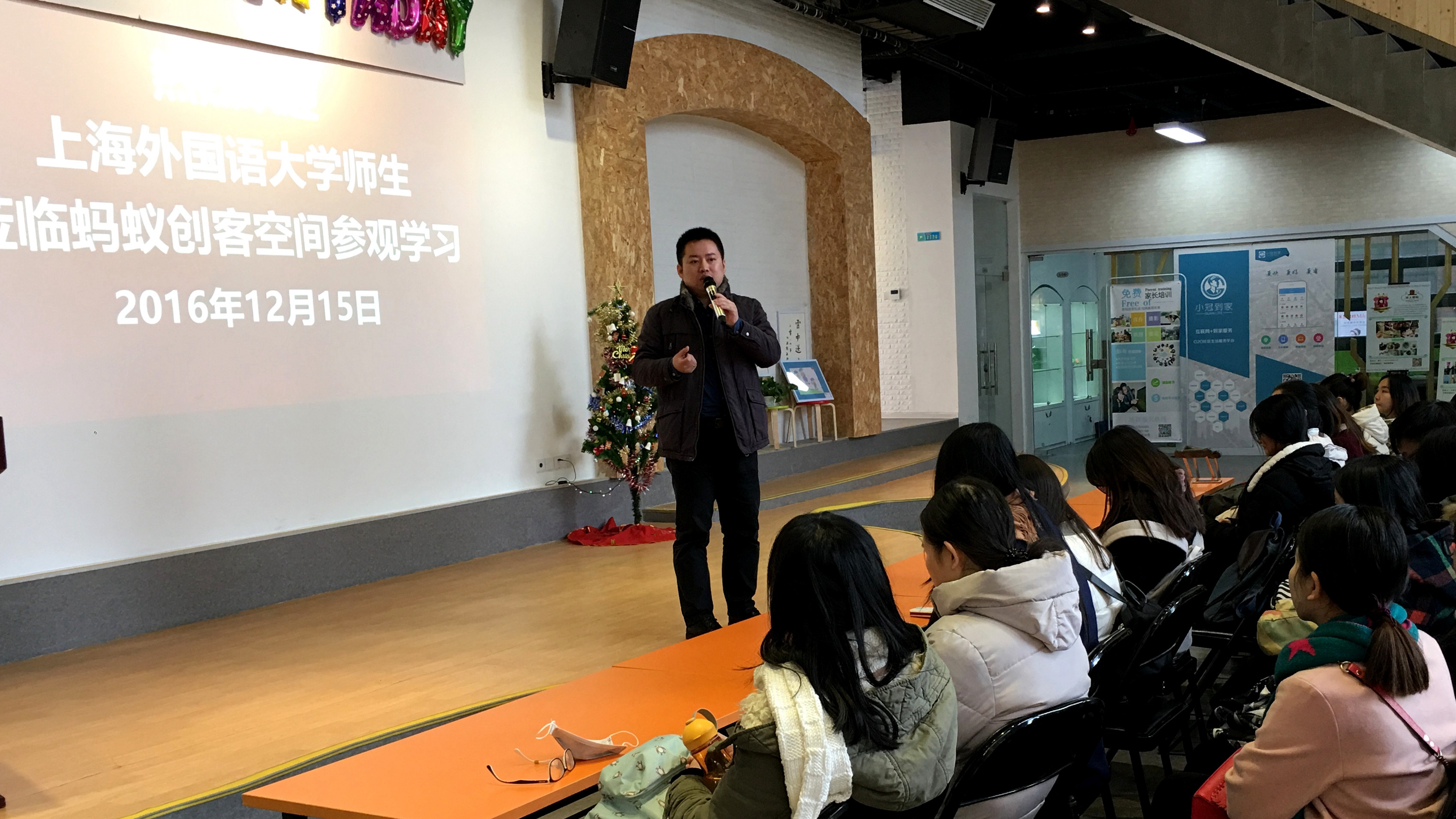 12月15日,上海外国语大学互联网创新创业实践基地为期一天的主题实践教学活动在依托单位蚂蚁创客空间顺利开展。上海外国语大学互联网创新创业实践基地负责人、MBA中心主任吴昀桥,国际工商管理学院辅导员赵珂,MBA中心市场经理毕振丽等学院相关老师同近200名国际工商管理学院本科学生一起与互联网创新创业实践者、企业家相互碰撞、交流,强化了同学们对管理知识与商务实践的感受与理解。