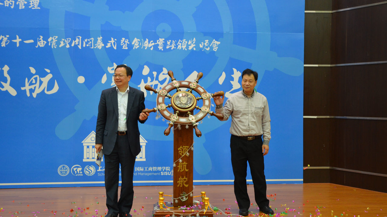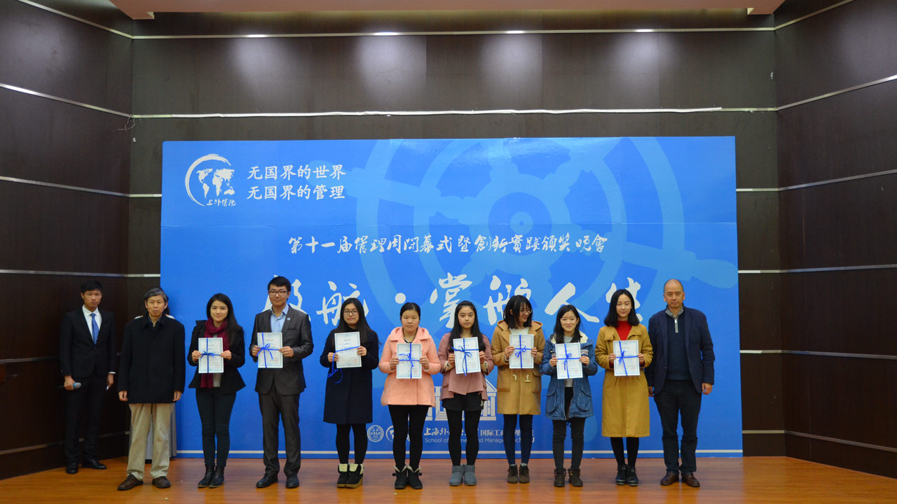 2016年12月20日下午,上海外国语大学国际工商管理学院第十一届管理周闭幕式暨创新实践颁奖晚会在上海外国语大学松江校区图文西厅拉开帷幕。院长范徵、党总支书记徐永、党总支副书记曹姝婧、信息管理与信息系统专业系主任韩耀军、工商管理专业系主任苏宗伟、MBA中心主任吴昀桥以及教师代表和各年级辅导员老师们出席了此次颁奖晚会。