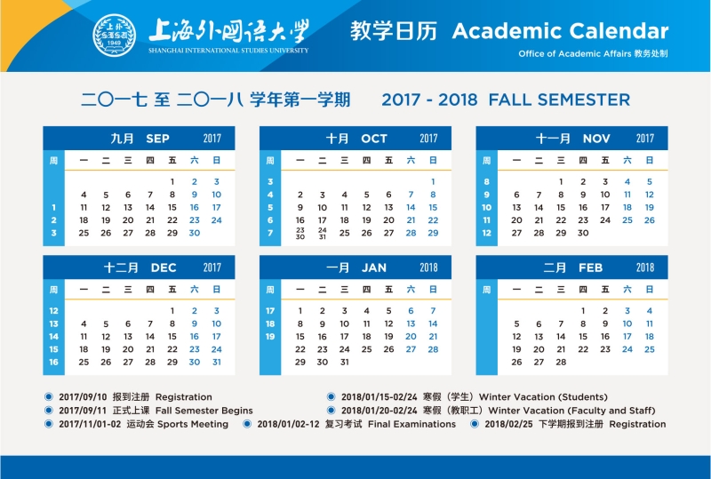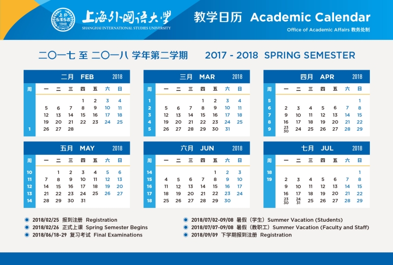 上外办〔2017〕37号 签发人:杨力 关于2018年放假安排的通知 各单位: 为方便师生员工安排相关业务,根据2017年11月30日发布的《国务院办公厅关于2018年部分节假日安排的通知》(国办发明电〔2017〕12号),结合我校校历安排和教学实际情况,决定将2018年放假做如下安排: 一、元旦:1月1日(星期一)放假,与周末连休。 二、春节:2月15日至21日仍在我校寒假假期中,无需另作安排。 三、清明节:4月5日(星期四)至7日(星期六)放假调休,共3天。4月8日(星期日)正常上班上课,安排星期五的教学工作。 四、劳动节:4月29日(星期日)至5月1日(星期二)放假调休,共3天。4月28日(星期六)正常上班上课,安排星期一的教学工作。 五、端午节:6月18日(星期一)放假,与周末连休。 六、中秋节:9月24日(星期一)放假,与周末连休。 七、国庆节:10月1日(星期一)至7日(星期日)放假调休,共7天。9月29日(星期六)、9月30日(星期日)正常上班上课。9月29日安排星期四的教学工作,9月30日安排星期五的教学工作。 放假期间,各单位需妥善做好领导值班安排,处置意外、突发事件,并请做好防火、防盗、防汛等安全防范工作。寒、暑期各单位仍实行值班制度,处理日常事务,相关值班要求另文发布。若年内因特殊情况,放假安排有所调整,将另行发文通知。 特此通知。 上海外国语大学 2017年12月12日