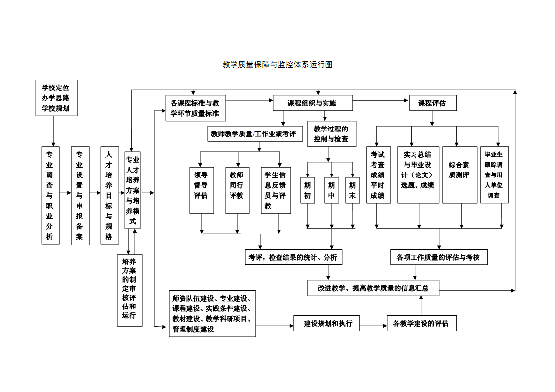 (八)加强和完善考试质量的管理与分析制度。考试是检查学生学习成绩的重要手段,是教学质量评价体系的重要组成部分,加强考试环节的管理有助于提高教学质量和管理效率,有助于规范教师的教学行为。 (九)加强和完善本科生毕业论文(设计)的规范管理和质量控制。毕业论文(设计)是本科教学培养方案的重要组成部分,是体现学生所学专业理论知识以及技能水平的重要方式,抓好这一环节的工作,有利于学生巩固和运用专业基本理论、基础知识、基本技能,扩大科学视野,增强创新精神。学院(系、部)要严格执行《上海外国语大学本科毕业生撰写毕业论文规定》、《上海外国语大学本科毕业生毕业论文撰写相关细则》。加强对毕业论文(设计)的管理和指导,不断提高毕业论文(设计)的质量。 (十)加强和完善毕业生质量与就业分析。通过该环节的管理,可以全面了解用人单位对我校毕业生质量的评价及建议,为学校改革人才培养模式提供依据。学工部、就业指导中心每学年都必须对毕业生的就业情况进行总体分析,通过访谈、问卷调查、个别追踪等多种方式,对毕业生质量进行监测,并提出教育、教学工作的意见和建议。 (十一)坚持和完善教学事故的认定与处理制度。建立教学事故的认定与处理制度是为了加强教学与教学管理工作的科学性、规范性、严肃性,严肃教学纪律,维护教学秩序,保障教学质量的重要手段,具体要求,按照《上海外国语大学教学事故认定与处理办法》认真执行。 (十二)建立校级教学基本状态数据库系统。教学基本状态数据是反映高校教学工作运行状况和教育质量的重要依据之一,是办学水平、办学实力的重要体现。要建立和不断完善校级的教学基本状态数据库系统,使教学状态和教学质量的监测信息化、常态化,从而为上级主管部门决策提供相关数据,为各级各类的评估检查提供依据,为学校教学质量监控提供坚实的平台。 四、教学质量保障与监控体系的组织保障 (一)教学质量是学校的生命线,全校各个部门都要树立质量意识,要形成全校各部门共同关注、共同参与教学质量管理的新局面。 (二)教学质量与评估科是教务处负责全校教学质量管理的具体职能部门,具体负责规定在实施教学质量控制等方面的职责并制订相关的工作程序。 (三)加强院系教学质量管理职能,明确各学院(系、部)一把手为教学质量第一责任人,明确各学院(系、部)教学秘书的任职条件及职责范围,加强对院系教学管理人员的培训。 (四)不断优化教学管理队伍,无论是教务处,还是各学院(系、部),教学管理人员的学历要逐步提高到硕士及以上层次。要注意从教学优秀的教师中选拔培养教学管理干部,重要岗位的教学管理干部必须有一定的教学经历。