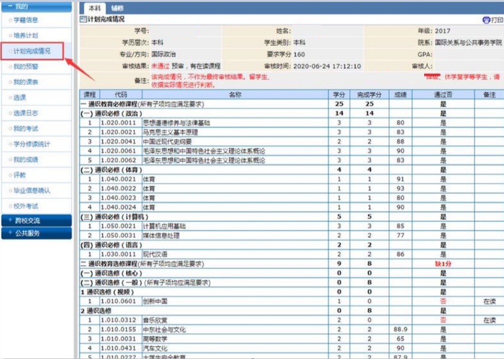 2)选课前和选课过程中,请仔细研究自己的计划完成情况,参照 “我的”—“计划完成情况”如下图: