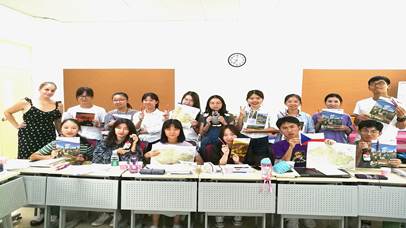之后,外教Pavlína为同学们带来了捷克人视角下的“捷克共和国一览”。她深入浅出地从地理位置、政治体制、行政区划、风土民情、经典人物等方面介绍了捷克这个自然风光旖旎优美、人文景观极具魅力的美丽国度,与上外捷克语专业要求学生学习捷克语语言、文学、历史、政治、经济、外交、社会文化等方面的基本设想不谋而合。在第一课的结尾,外教还贴心地为同学们带来了来自捷克驻沪总领事馆和查理大学的问候,将印有“Univerzita Karlova”(查理大学)字样的纪念品文具和领事馆赠送的捷克风情画册作为礼物送给大家。
