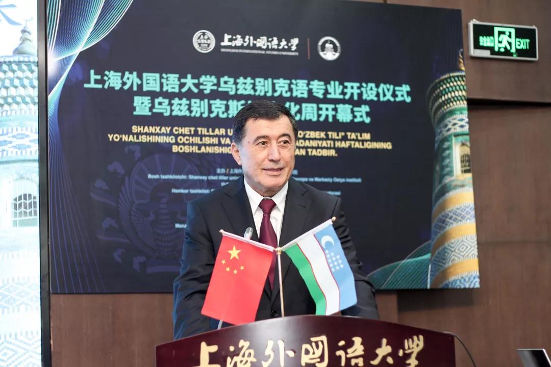 塔什干国立乌兹别克语语言和文学大学校长西拉日基诺夫先生、国立世界语言大学副校长马德拉合莫夫先生、撒马尔罕国立外国语学院副校长阿树罗夫先生等出席活动并致辞。乌兹别克斯坦共和国驻上海总领馆总领事阿戈扎姆呵德热耶夫先生到场祝贺。中华人民共和国驻乌兹别克斯坦共和国特命全权大使姜岩女士通过视频祝贺上海外国语大学成立乌兹别克语专业。