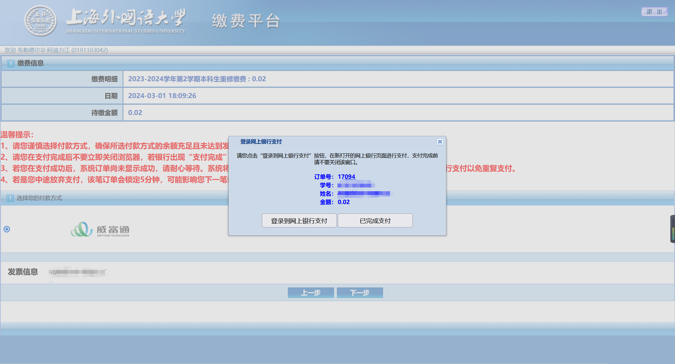 第二步,进入缴费平台,阅读通知后,点击“下一步”,根据弹窗提示,请点击“登录到网上银行支付”。