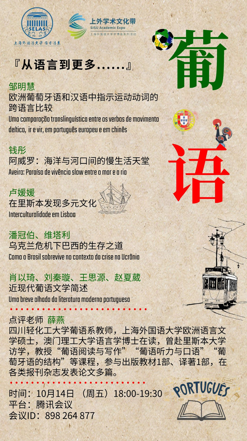 SISU云端学术角第四十六期由教务处主办,由西方语学院承办,以「从语言到更多……」为活动主题,将于10月14日18:00准时开启,活动由一流本科专业之一的葡萄牙语专业五名同学担当主讲,欢迎大家积极参与!