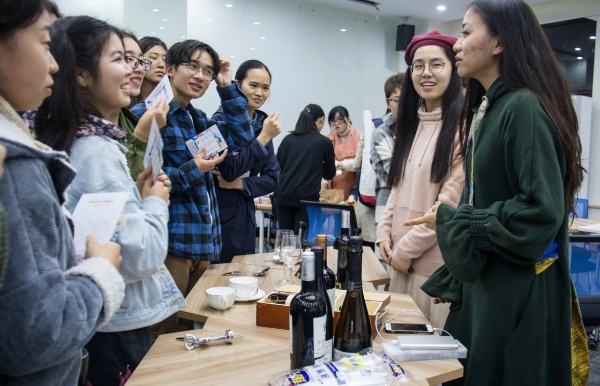 长廊里飘着红酒的香醇和法式糕点的酥香,带我们来带法语系的主场。法式就餐礼仪、红酒知识、法语名言名著知识介绍等丰富的活动更让心怀法语情愫的学子们过足了一把瘾。德语的活动人员身穿德国民族特色服装,向大家推荐德国的小食,并通过游戏互动介绍德国各联邦政府的名胜古迹、风土人情。英语学院主场里正上演着莎士比亚的经典话剧,同学们通过知识板和话剧表演了解莎士比亚传奇的一生和他留下的璀璨经典。在布满樱花的纸伞、和服和纸扇的教室里,日本文化经济学院用20分钟的微课堂介绍了樱花浪漫凄美的含义。