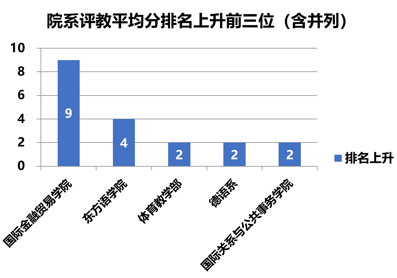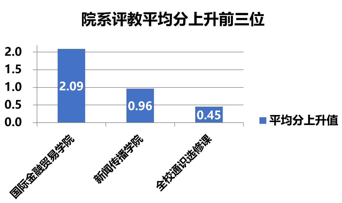 根据与上学期数据对比,18个开课院系(部)课程评教平均分上升幅度最大的前三位是国际金融贸易学院(上升2.09分)、新闻传播学院(上升0.96分)、全校通识选修课(上升0.45分)。排名上升幅度最大的前三位是国际金融贸易学院(上升9名)、东方语学院(上升4名)、体育教学部、德语系、国际关系与公共事务学院(并列,上升2名)。