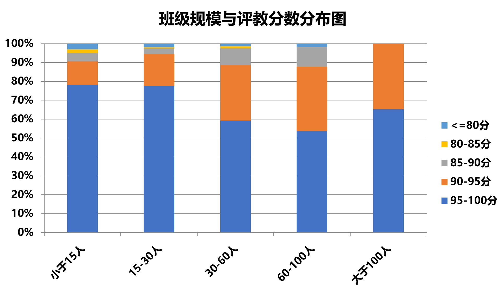 根据不同班级规模评教平均分统计,小于15人的为96.92分,15-30人的为96.44分,30-60人的为94.65分,60-100人的为94.39分,大于100人的为95.72分。当班级规模超过30人时,评教得分偏低。不同班级规模评教得分分布见下图。