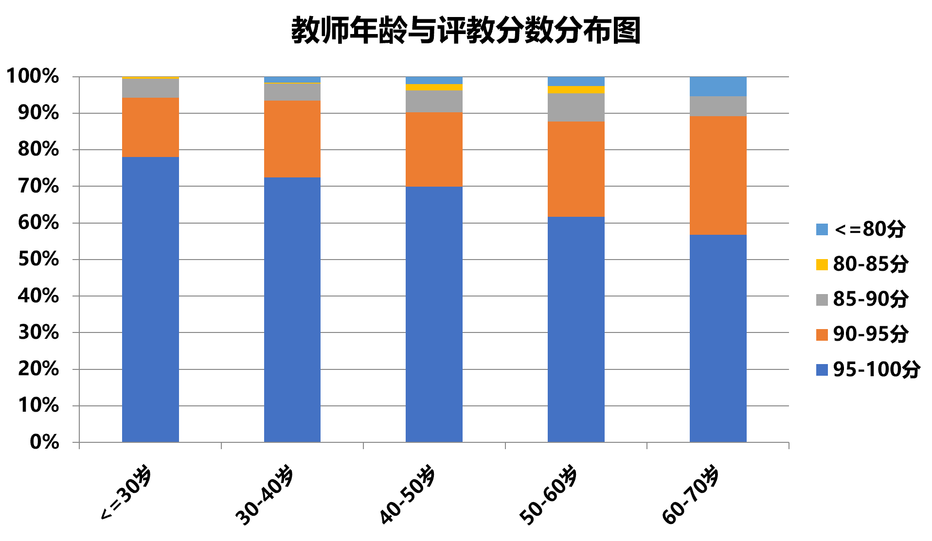 根据教师年龄段统计评教平均分,30岁及以下为96.59分,30-40岁为96.22分,40-50岁为95.64分,50-60岁为94.87分,60-70岁为94.86分。不同年龄段教师评教得分分布见下图。