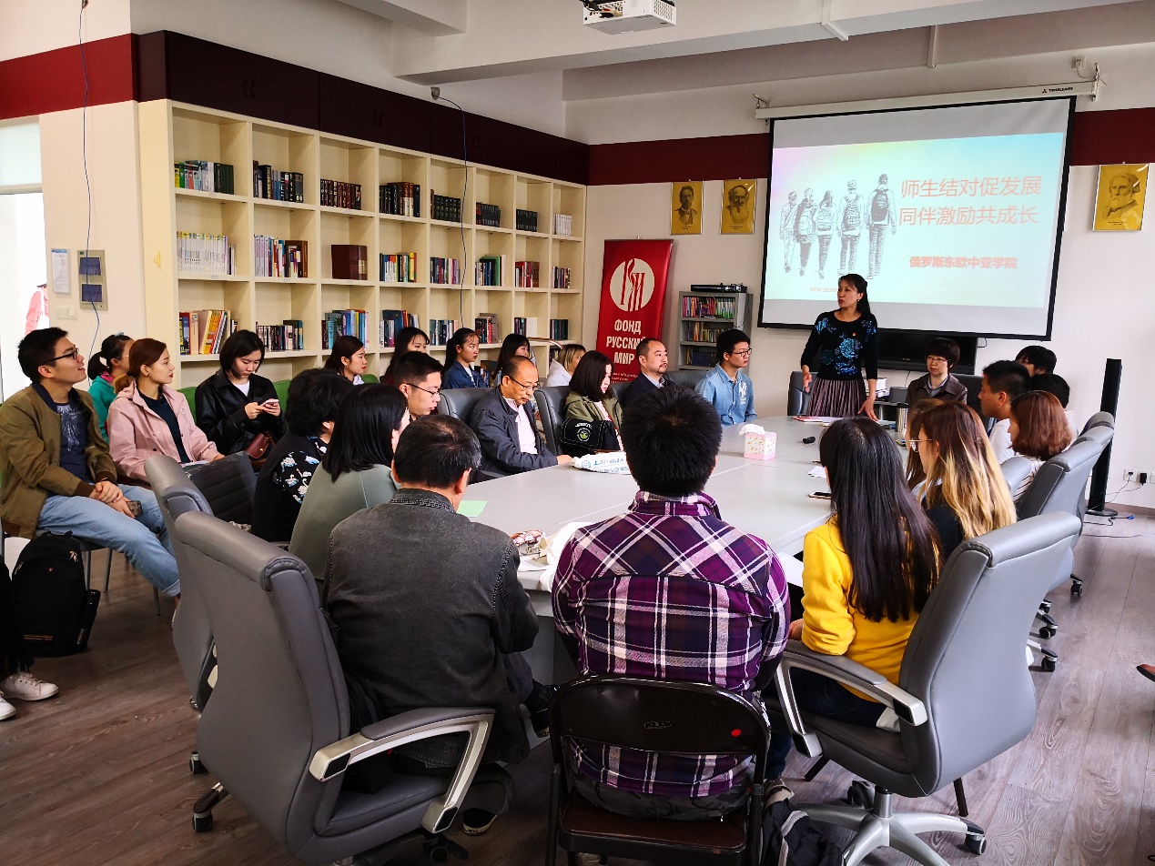 活动由俄欧亚学院教工支书记苏祖梅老师主持,首先由负责本科教学督导工作的高少萍老师向在座的师生介绍了本次活动的形式和具体内容。此次结对活动共有俄欧亚学院10名党员教师、俄语系15-1710