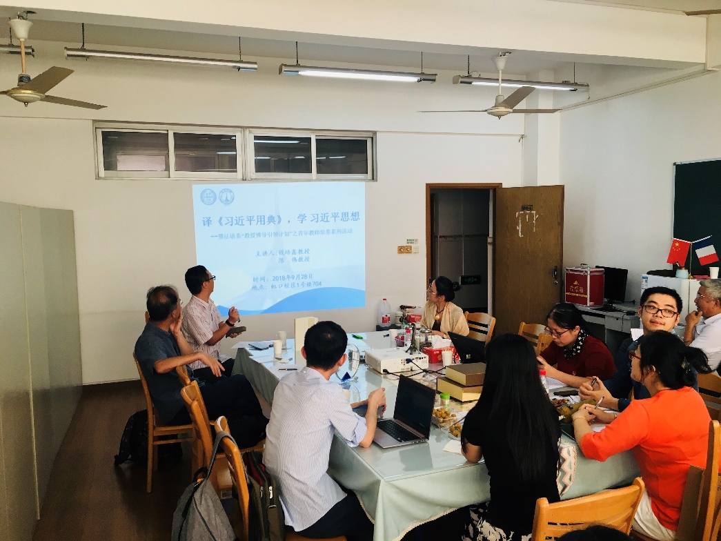 2018年9月28日下午,法语系博导钱培鑫教授和陈伟教授以翻译《习近平用典》外译项目的过程体会为主旨,将思政教育与教学科研工作有机结合,在全系展开《习近平用典》翻译学习分享会,对其现实意义和背景义理进行解读、阐释,引导青年教师树立“课程思政”理念,深入推进法语系课程思政教育教学改革。